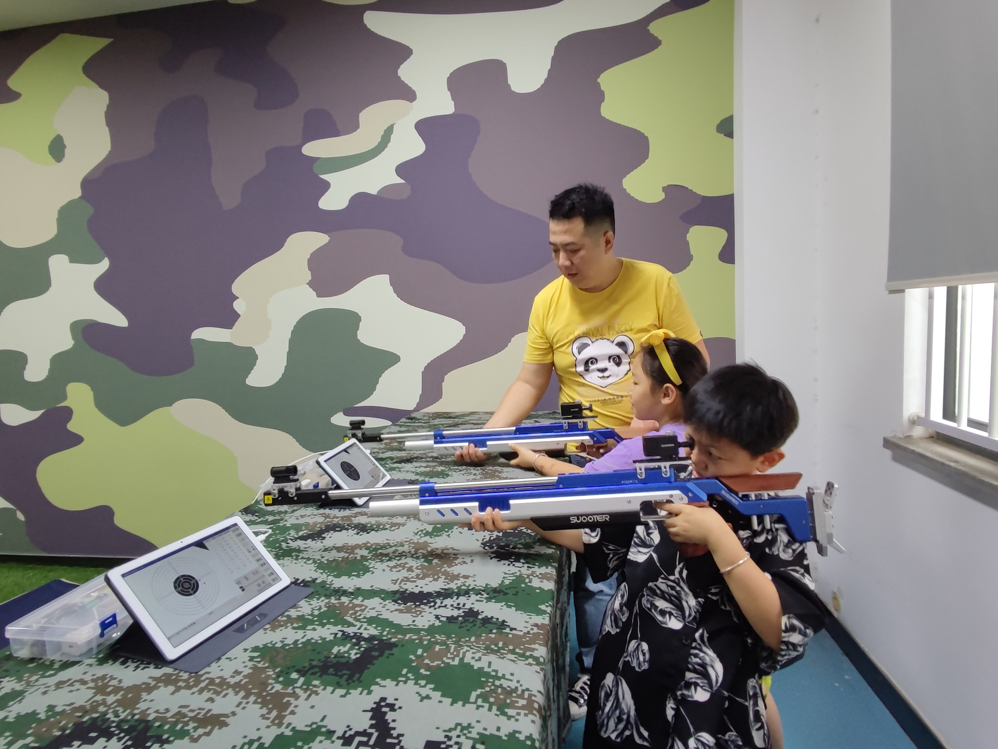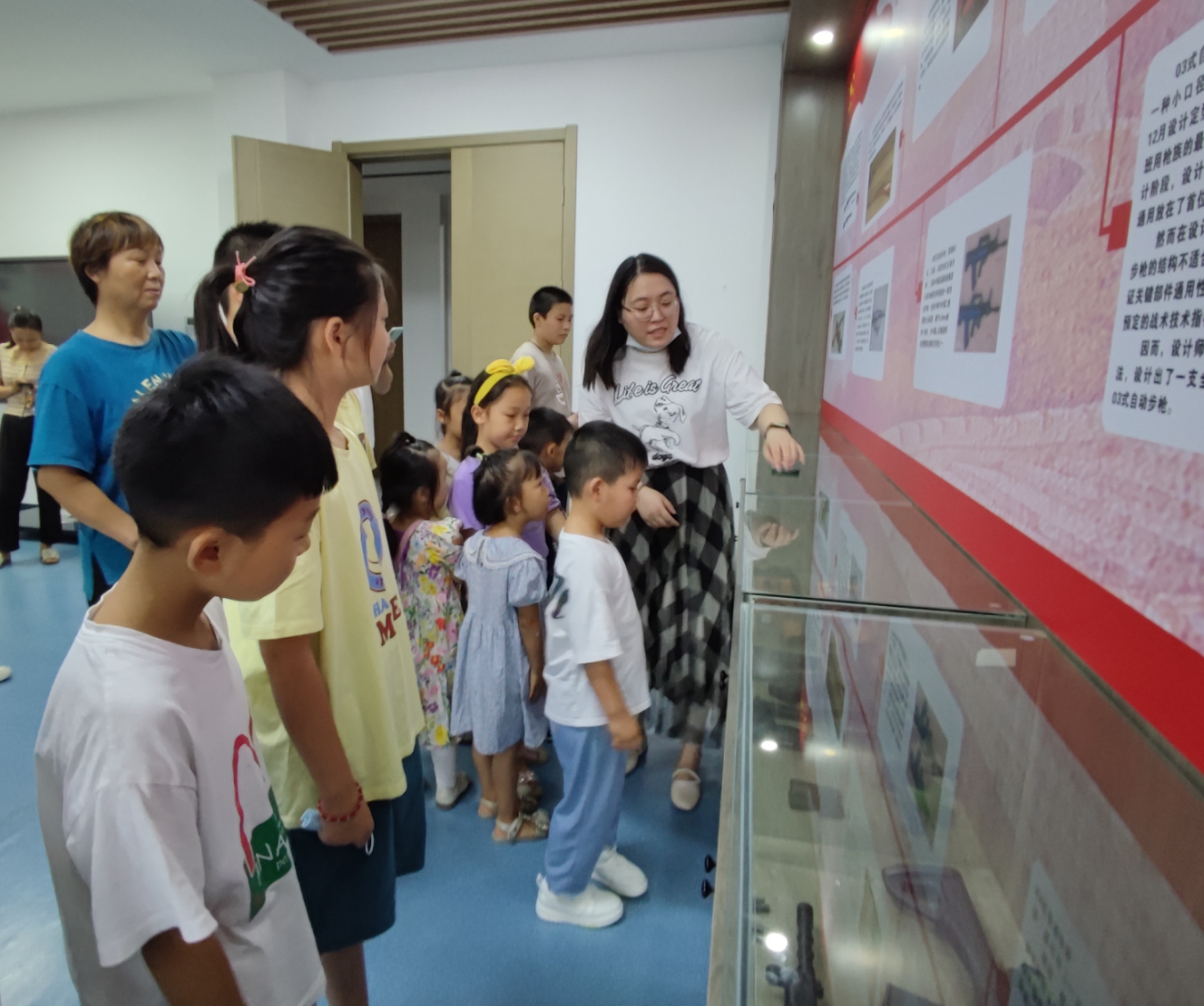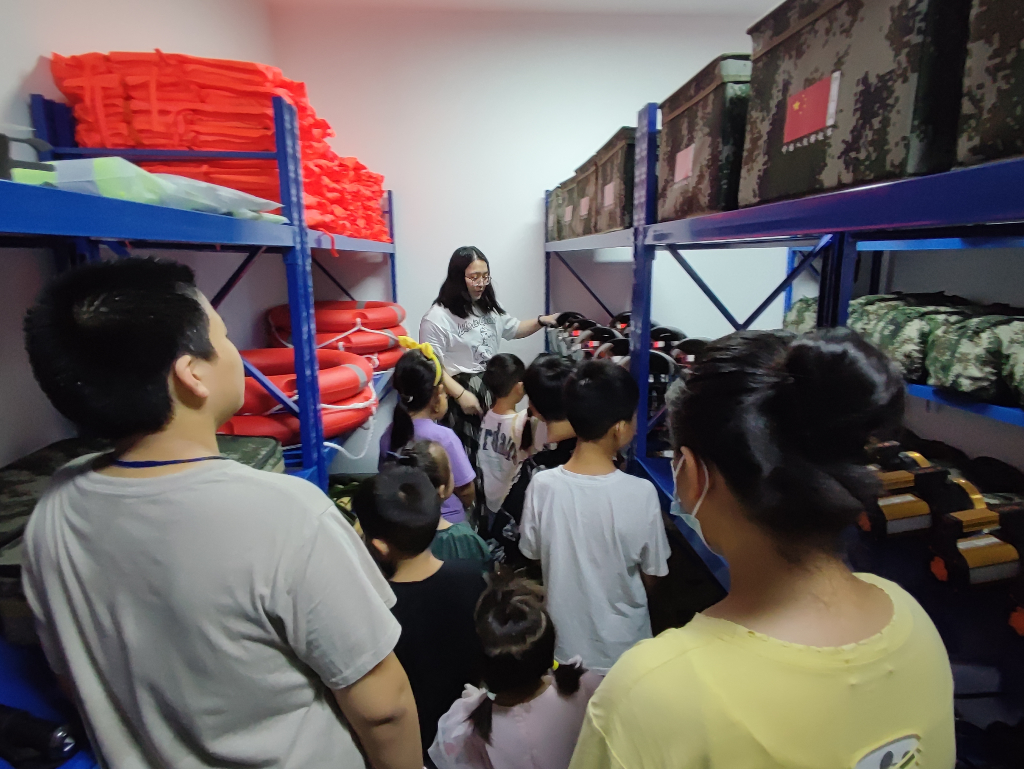 活动开始,在社工的带领下孩子们来到民兵营参观了仿真枪械、军用物资以及模拟射击场三个场地,首先参观的是仿真枪械,社工向孩子们讲解武器装备的知识,孩子们一边看着展品,一边听着讲解,了解了中国民兵的发展史,感受着国家强大的国防力量。在参观的过程中,一位小男孩问到:“这是什么枪?是哪个年代的?”,社工耐心的向孩子们解释。在经过十几分钟的参观后,孩子们对武器装备产生了浓厚的兴趣,随后,社工让孩子们体验射击并向大家展示射击的方法和注意事项,孩子们都跃跃欲试,亲身体验了一次模拟射击。