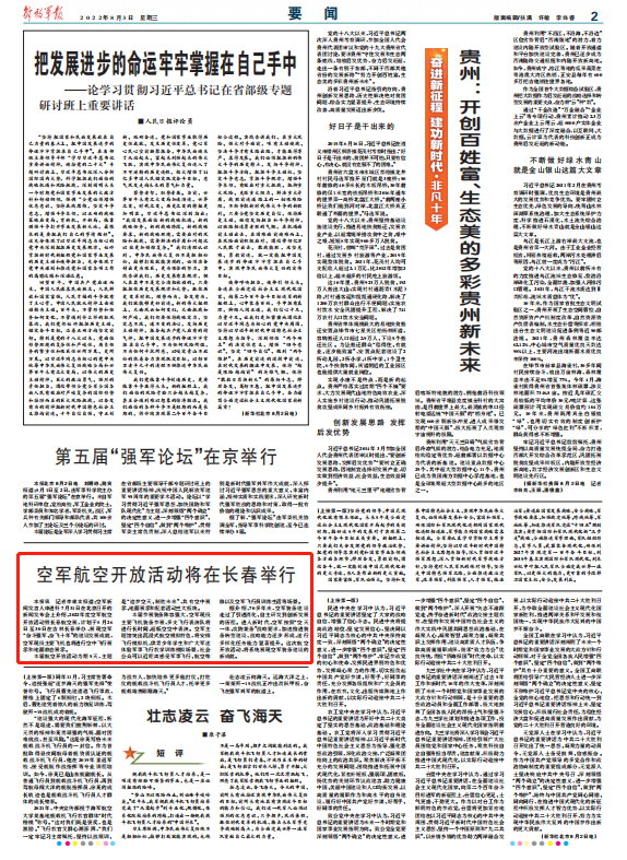 解放军报讯(记者李建文)空军新闻发言人申进科7月31日在北京召开的新闻发布会上介绍,2022年度空军航空开放活动暨长春航空展,计划于8月26日至30日在吉林长春举办,展现空军“奋斗强军、奋飞十年”的建设发展成就,空军现役主要飞机也将进行空中飞行展示和地面静态展示。