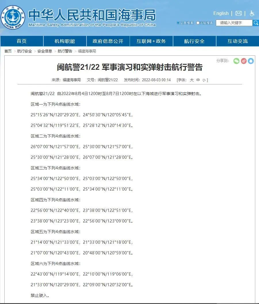 闽航警21/22,从2022年8月4日1200时至8月7日1200时在以下海域进行军事演习和实弹射击。