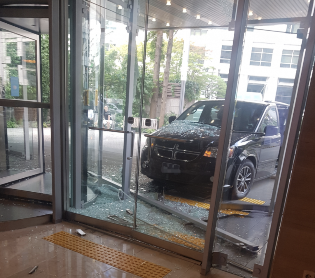 当地时间4日下午,美国驻韩大使馆的一辆汽车撞上了首尔钟路区寿松洞的一栋大楼后门,现场玻璃散落一地。图源:《先驱经济》