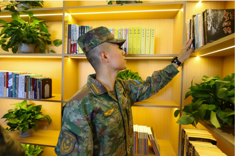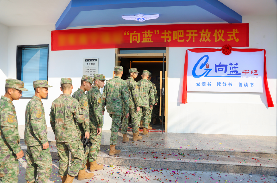 “向蓝书吧”的“向蓝”二字取自追求更高空天,学无止境之意,书吧本身是集阅读、休闲于一体的体验式阅读场所,占地90平方米,书吧内,环境简约而雅致,处处彰显着强军文化,陈列有党建读物、军事政治、文学、艺术、百科、哲学等几大类三千余册图书。