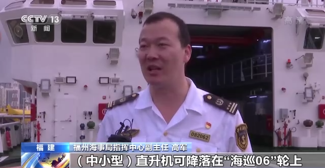 福州海事局指挥中心副主任 高军:中小型直升机可降落在“海巡06”轮上,平台上的小孔和两舷的灯可以保障直升机在夜间起降。