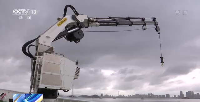 “海巡06”轮大副 刘耿锋:这两台设备就是“液压折臂吊”,最大臂展12米,在臂展12米时可安全吊重5.5吨,能够在各种海况下配合专业救生吊篮、救生捞网进行作业。