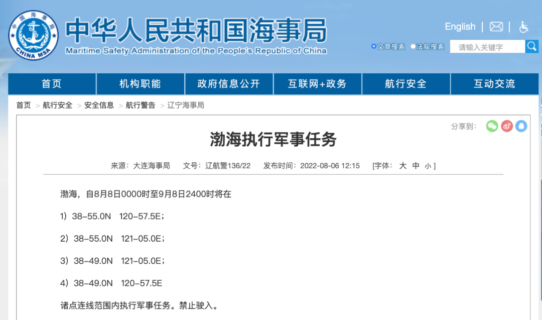 据中国海事局网站消息,大连海事局发布航行警告,自8月8日0时至9月8日24时,渤海部分海域执行军事任务,禁止驶入。