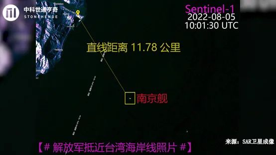 8月6日晚,国内科技公司中科世通亨奇公布了一张由国外合成孔径雷达(SAR)卫星于8月5日上午10时许拍摄的卫星图。中科世通亨官方微博账号表示,根据多域态势系统的追踪,8月5日我军南京舰在花莲附近海域活动,距离花莲和平火力发电厂的烟囱直线距离约11.78公里。