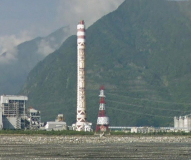 花莲和平电厂确实有一座高耸的烟囱建筑,电厂在其官网介绍称,该厂位于花莲县秀林乡和平村和平工业区内,设计有两台66万千瓦燃煤火力发电机组,全厂装置容量132万千瓦。电厂的烟囱高达250米,烟囱上画有台湾少数民族图腾。这座电厂也据称是台湾东部目前发电量最大的电厂。