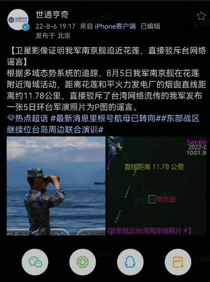 对于我军抵近台湾海峡一事,台湾部分媒体在6日下午无端炒作我军舰“打卡”图是“P的”。台湾一些媒体援引花莲“观鲸业者”的话“辟谣”称,他们观鲸业“业务繁忙”,在8月5日当天“没有看见解放军军舰”,因而断定这是“PS出来的图片”,台湾不少亲绿媒体还呼吁台湾居民“保持冷静”。对此,中科世通亨奇在微博表示,这张卫星照片,直接驳斥了台湾媒体有关我军发布的环岛演习照片是“P图”的谣言。