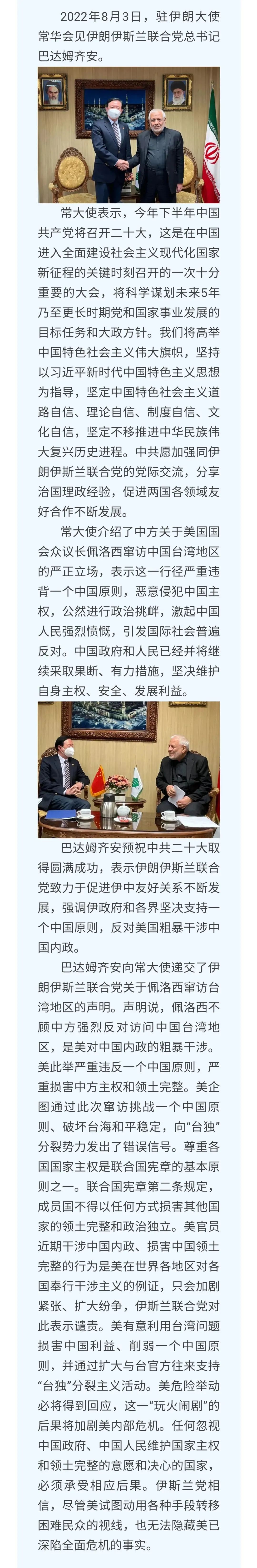 伊朗伊斯兰联合党发表声明谴责佩洛西窜访台湾地区