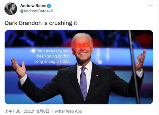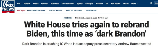 “白宫再次试图重新命名拜登,这次是‘黑暗布兰登’”,美国福克斯新闻网8日以此为题的报道称,由于近日一系列的立法胜利(多项法案成功通过),美国白宫副新闻秘书安德鲁•贝茨8日在推特上发布了一张眼睛发射着红色激光的拜登照片,并写道:“黑暗布兰登正在摧毁它。”然而贝茨随后发布的另一张照片却被保守派人士质疑使用了“纳粹鹰”的标志。