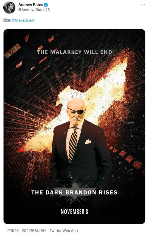 据报道,贝茨发布的“黑暗布兰登”照片上还写道:“你的胡言乱语已经持续得够久了,伙计。”随后,贝茨在推特上又发布了另一张拜登照片,上面写有“胡言乱语将结束”和“黑暗布兰登崛起”,以回应一条批评他前一条推文的推特。这张照片似乎借鉴的是电影《蝙蝠侠:黑暗骑士崛起》的海报。