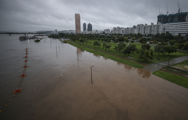 当地时间9日上午,首尔市麻浦区汝矣岛汉江公园被雨水淹没。 图自韩媒
