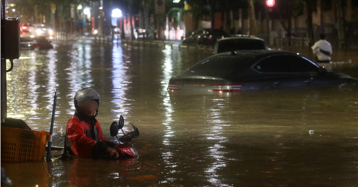 当地时间8日晚,首尔市江南区道路积水,车辆被雨水淹没熄火。 图自韩媒