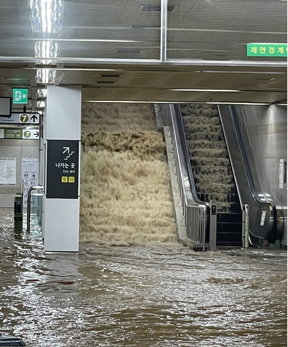 当地时间8日晚,雨水涌入首尔市铜雀区一地铁站内。图自韩媒