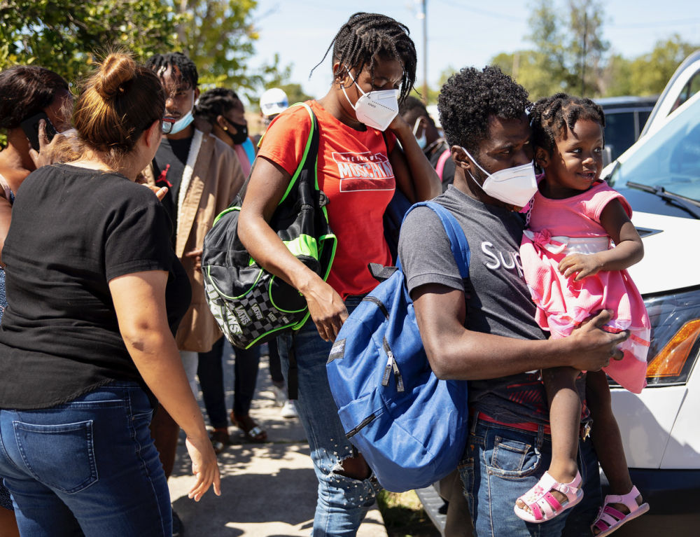 2021年9月24日,越过美墨边境的移民在美国得克萨斯州德尔里奥等待上车。图片来源:新华社