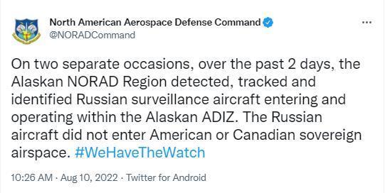 该司令部在推特上发文称,在过去两天内,曾两次发现、跟踪并确认俄罗斯侦察机进入阿拉斯加防空识别区,并在其范围内活动。不过,推文说,“俄罗斯飞机没有进入美国或加拿大的主权领空。”