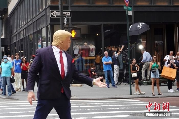 资料图:当地时间8月10日,一名戴着面具的示威者在美国纽约特朗普大厦外模仿美国前总统特朗普。近两日,特朗普大厦前示威者、记者、围观民众等人流聚集。 中新社记者 廖攀 摄