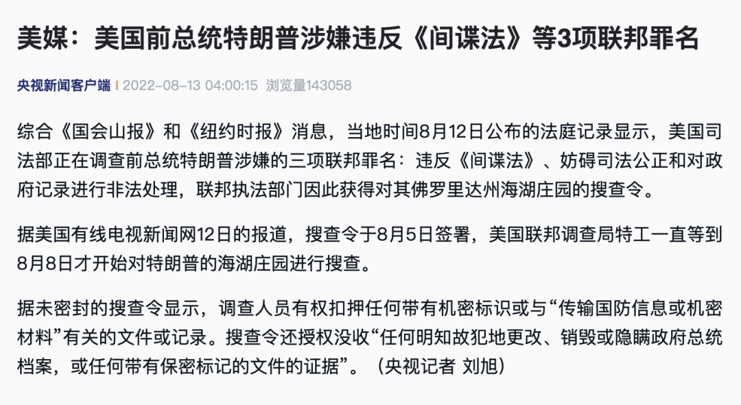 据央视新闻客户端消息,综合《国会山报》和《纽约时报》消息,当地时间8月12日公布的法庭记录显示,美国司法部正在调查前总统特朗普涉嫌的三项联邦罪名:违反《间谍法》、妨碍司法公正和对政府记录进行非法处理,联邦执法部门因此获得对其佛罗里达州海湖庄园的搜查令。