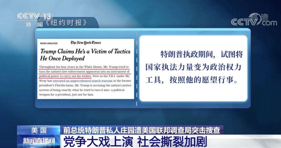 这样的撕裂也体现在美国媒体上。《纽约时报》直接指责特朗普,称其执政期间试图将国家执法力量变为政治权力工具,按照他的愿望行事。《纽约时报》还讽刺地表示,现在特朗普反过来指责国家司法系统变成了总统的武器。