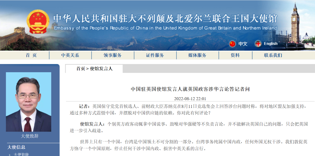 8月12日晚,中国驻英国使馆网站发布《中国驻英国使馆发言人就英国政客涉华言论答记者问》全文如下: