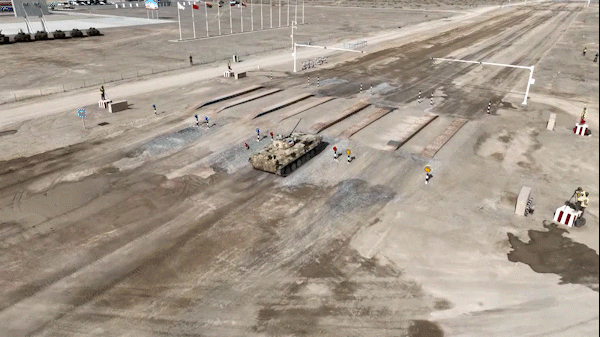 “苏沃洛夫突击”比赛现场硝烟弥漫,如同一个浓缩的战场环境,更是赛事设置实战化的体现。整个赛场越障高度设为战车性能峰值,涉水深度接近装备极限。在这种高强度、超负荷的环境下,各参赛队开足马力绝尘而去,展现出了良好的战斗风貌。