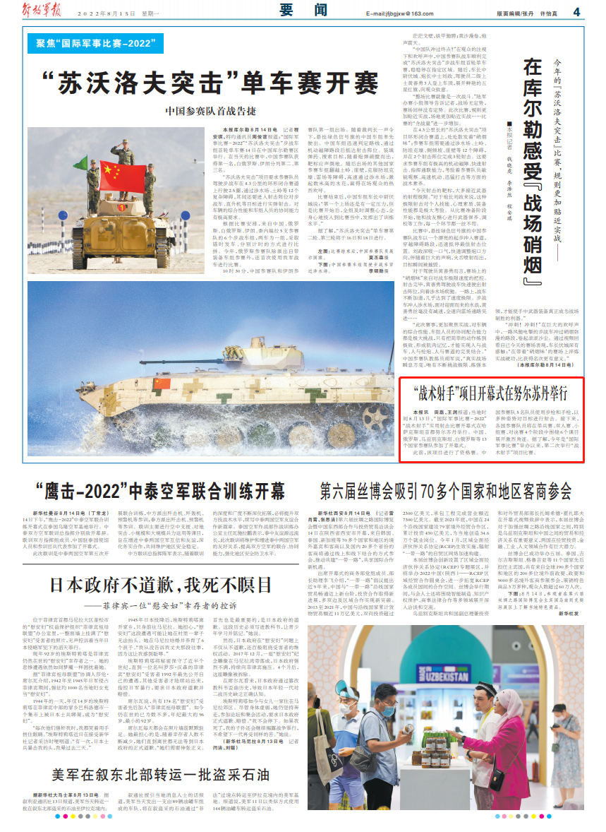 解放军报讯(田磊、王润)当地时间8月13日,“国际军事比赛-2022”“战术射手”实用射击比赛开幕式在哈萨克斯坦首都努尔苏丹举行。中国、俄罗斯、乌兹别克斯坦、白俄罗斯等13个国家参赛队参加了开幕式。