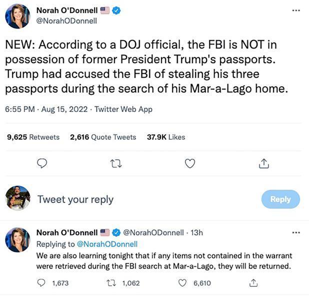 几小时后,哥伦比亚广播公司(CBS)晚间新闻节目主持人诺拉·奥唐纳(Norah O’Donnell )在推特上写道:“新消息:据一名司法部官员称,FBI并不持有前总统特朗普的护照。”