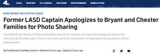 2020年1月,球星科比与女儿等9人因直升机事故身亡。有多名警员涉嫌参与拍摄、分享科比坠机现场的照片,引发死者家属不满并对美国洛杉矶县警察局等提诉。今年8月11日,科比遗孀瓦妮莎提诉案开庭审理。据此前报道,洛杉矶县先前已同意支付250万美元与另外两位遇难者的家人就相似诉讼达成和解协议,不过瓦妮莎不同意和解,据称她打算寻求更多赔偿。