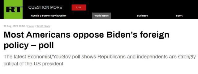 据今日俄罗斯电视台(RT)17日报道,英国《经济学人》杂志和民调机构YouGov周三公布的一项调查结果显示,大多数美国人“强烈反对”或“有些反对”美国总统拜登的外交政策。
