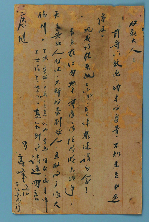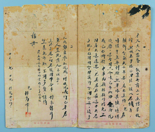 在战火纷飞、硝烟弥漫的抗日战场上,林高峰深深明白家人心中的担忧和挂念,为了宽慰亲人,他及时将前方的胜利佳音转报给家中。10月3日,他写信给双亲报告近来部队在前线英勇杀敌取得胜利的消息,信中写道:“本军在江南地方开展广泛的游击战争,天天与敌人打仗,不断牵制敌人,且取得了很大胜利。”同时,他请父母一定要及时转告与自己同时参军的同乡王胜、王集成、王直、王荣光等人的家属,“均在一块,身体平安”,并再三嘱托父母“请走他家”问候。