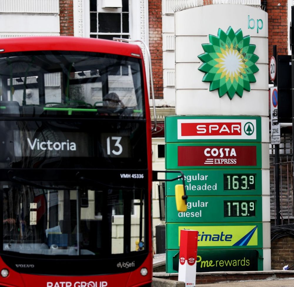 4月8日,一辆公共汽车经过英国伦敦一处加油站。新华社记者李颖摄