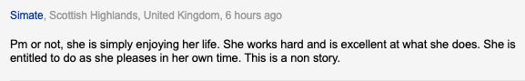 别管她是不是总理,她只是在享受自己的生活。她努力工作,做得也不错。她有权在自己的时间里做任何事。
