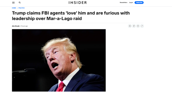 美国“商业内幕”网站:特朗普称FBI特工“喜爱”他,并且对他们那发起海湖庄园突袭行动的领导感到愤怒