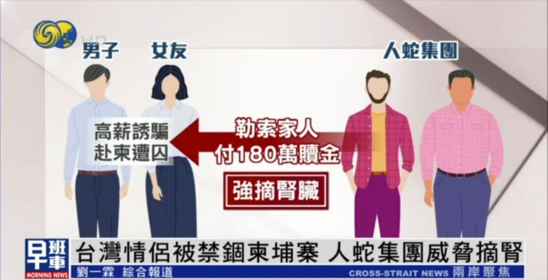 而台湾警方追查“卖猪仔”案件也相当困难,一对台湾情侣因高薪诱惑到柬埔寨打工却遭到囚禁,人蛇集团更威胁两人家属如果不付180万台币赎金,就要将两人的肾摘掉。