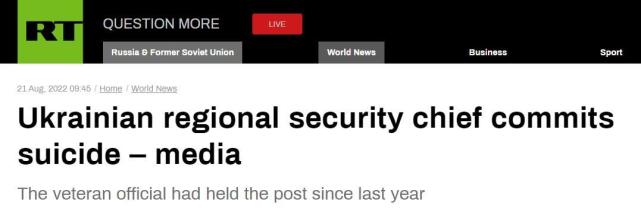 据今日俄罗斯电视台(RT)21日报道,当地时间20日晚上,乌克兰国家安全局(SBU)基洛夫格勒地区负责人被发现死于家中,有消息人士告诉当地媒体,这可能是一起“自杀”事件。