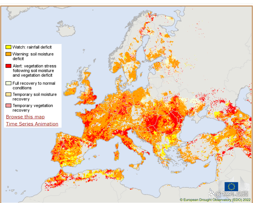 欧洲干旱观测中心官网发布的欧洲旱情示意图,大多数欧洲国家都已陷入干旱