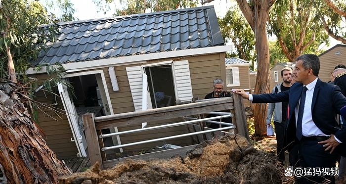 法国内政部长达尔马宁正在科西嘉岛查看被暴风雨破坏的民宅(图片来源:法新社)