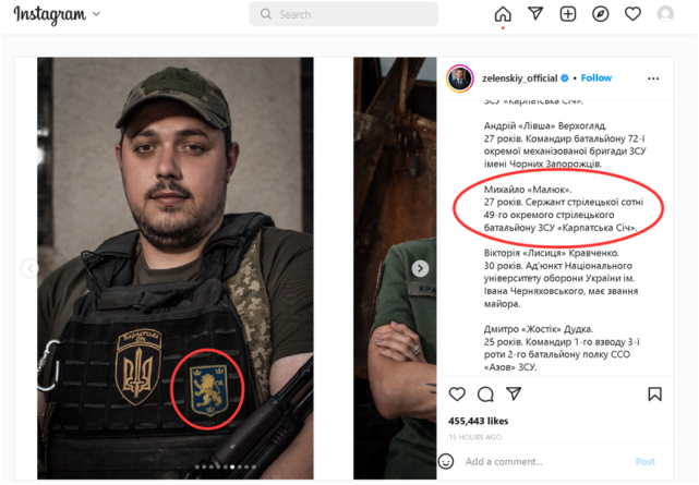 (图为乌克兰总统泽连斯基在乌克兰独立日当天贴出的一组士兵照片,其中图中这名士兵的胸前的一个狮子形状的徽记引发了争议)