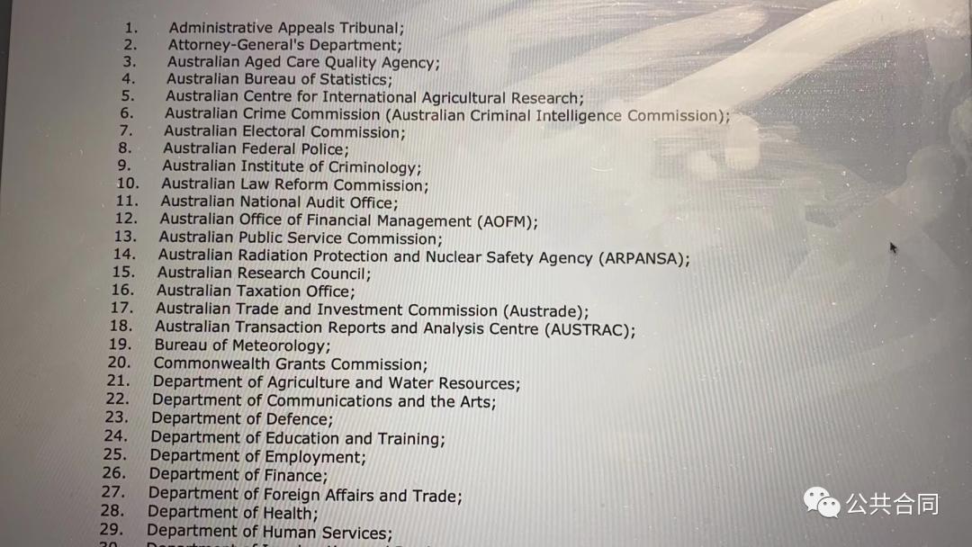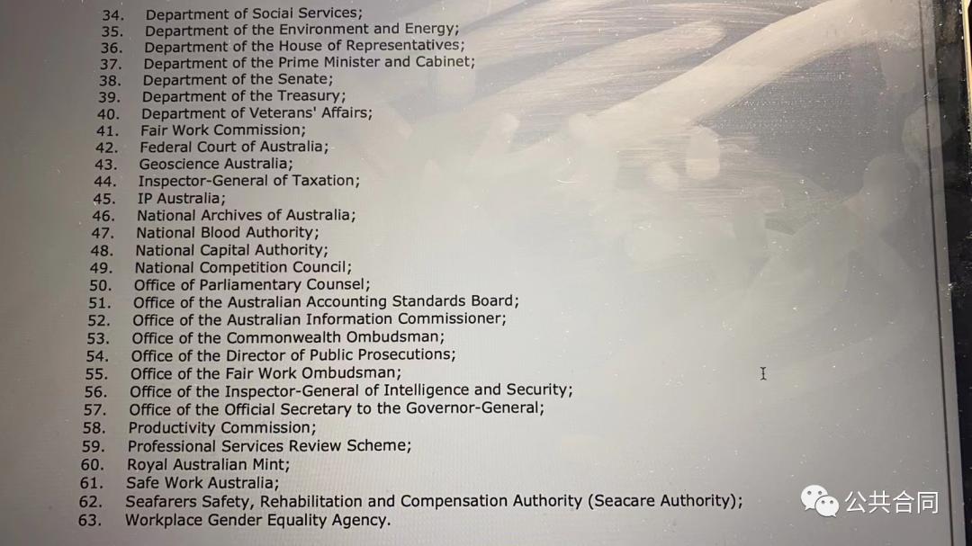 在首轮出价的65个实体中,GPA的多个缔约方提出澳洲的实体数量少于其他贸易协定中的出价,建议应该平衡一下,多增加几个实体。上面修订后的出价,有议会组织:参议院部、众议院部等;有行政机关:总理内阁部、财政部、澳洲金融管理办公室、国库部等;有军事机构:国防部等;有司法部门:澳大利亚联邦法院等;还有不少事业单位、研究机构。可是,这次修订后的清单不仅没有增加中央政府实体数量,反而减少至63个实体。看了前述的清单,估计新一轮针尖对锋芒、澳洲舌战群雄的激烈场面又将再现。除了所罗列的修订后的实体清单,澳大利亚与第一轮的做法一样,紧随实体名单,增加了以下的“但书”内容。