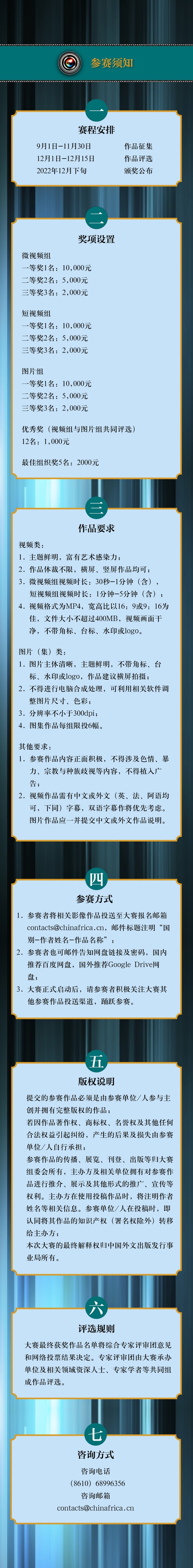 大赛即日起正式启动,共分为征集期、评审期和颁奖仪式三个环节。大赛结束后将组织优秀作品在中非主流媒体及其社交媒体账号广泛推介传播。参赛者请详细了解“参赛须知”并按要求投送作品。
