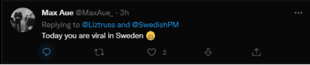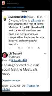 不过,有网友还是截图了瑞典首相安德松此前@了这位特拉斯“高仿号”的推文,内容与新推文一致。此外,仍可以看到这位仿冒特拉斯网友此前对瑞典首相这条乌龙推文的回复,她写道:“期待很快访问(瑞典)!把肉丸准备好。”↓