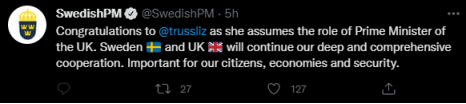 报道称,瑞典首相玛格达莱娜·安德松目前已将该推文删除,并重新发了一条、并@了真正的特拉斯:“祝贺特拉斯将当选英国首相。瑞典和英国将继续(发展)我们的深度全面合作。(这)对我们的公民、经济以及安全很重要。”↓