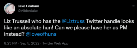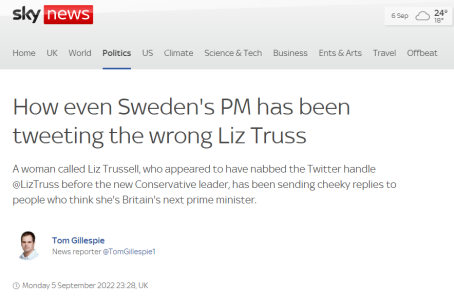 5日,特拉斯当选英国执政党保守党新党首,将在获得女王批准后正式就任首相。据英国天空新闻网报道,有一名叫做特拉塞尔、仿冒特拉斯的推特用户似乎在特拉斯(@trussliz)本人之前抢注了“@LizTruss”的账户名,并在社交平台十分活跃,以至于瑞典首相都在之后的祝贺贴文中@错了人......