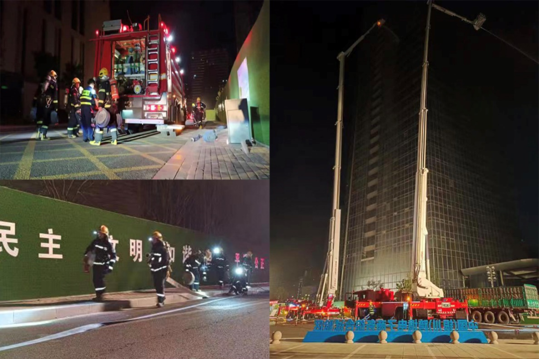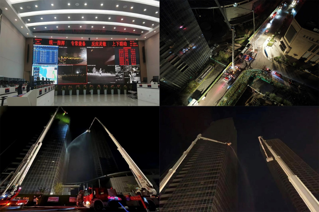 演练根据超高层建筑火灾事故特点和实际,坚持“救人第一,科学施救”的指导思想,贯彻“先控制,后消灭;以固为主,固移结合”的战术原则,设定指挥、侦察、搜救、灭火、举高、供水、保障等作战单元,采取“强攻近战、内外结合”等技战术,集中开展火情侦察、现场组织指挥决策、启用固定消防设施、延楼层铺设水带、外围举高射水灭火、被困人员搜索与营救、火场高层供水、战勤保障等演练环节。现场总指挥科学制定灭火行动方案,准确及时决策部署,各参演队伍、各战斗小组迅速按照部署展开灭火救援行动,进行科学综合救援。经全体参战人员奋力扑救,成功解救被困人员,大火彻底被扑灭,演练圆满结束。