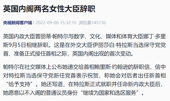 英国内政大臣普丽蒂·帕特尔与数字、文化、媒体和体育大臣娜丁·多里斯9月5日相继辞职。