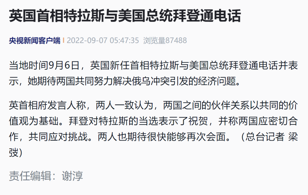 通话中,特拉斯表示,期待两国共同努力解决俄乌冲突引发的经济问题。英首相府发言人称,两人一致认为,两国之间的伙伴关系以共同的价值观为基础。
