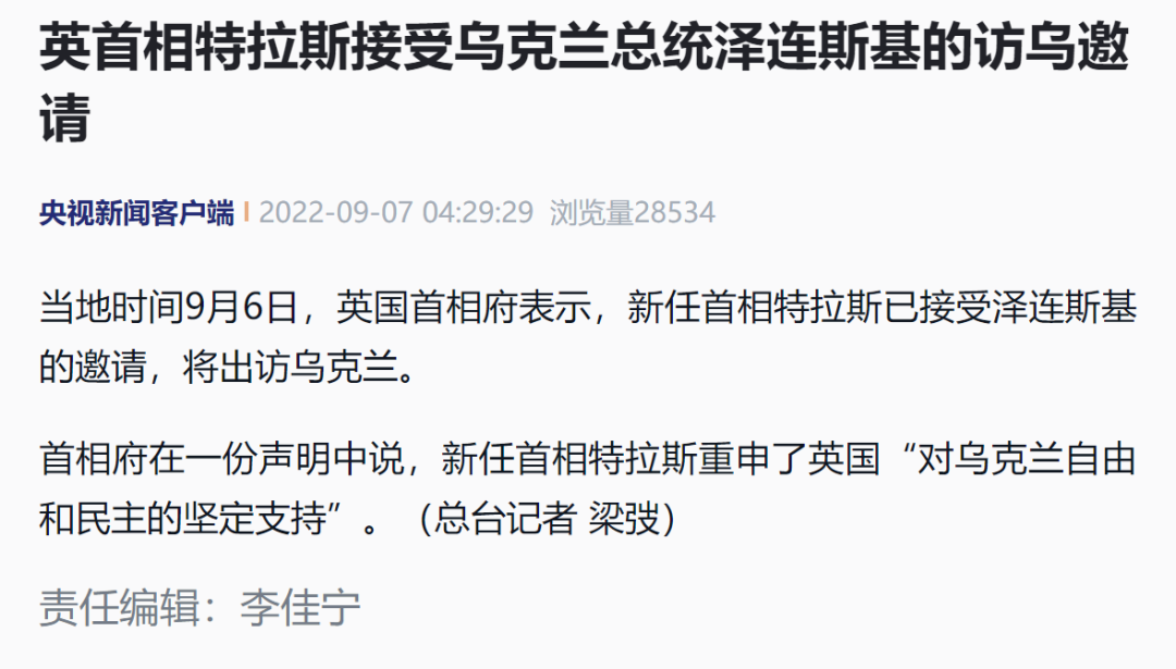 当地时间9月6日,英国首相府表示,新任首相特拉斯已接受泽连斯基的邀请,将出访乌克兰。首相府在一份声明中说,新任首相特拉斯重申了英国“对乌克兰自由和民主的坚定支持”。