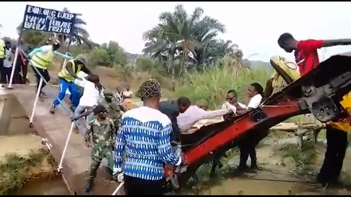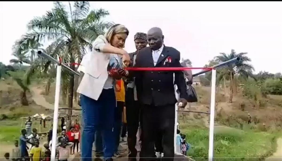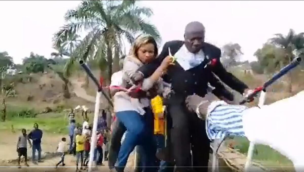报道称,刚果(金)一条小河原本有一座临时便桥,但因为洪水期间经常被淹没,当地官员决定在该处修建一座小型的人行桥,帮助当地居民在雨季过河。桥梁于近日建成,当地决定举办一个剪彩仪式。仪式现场,一群人登上了不到两米宽的桥,在桥的末端,有一条红丝带系在栏杆上。而桥下,也有不少人在现场围观,等待庆祝。