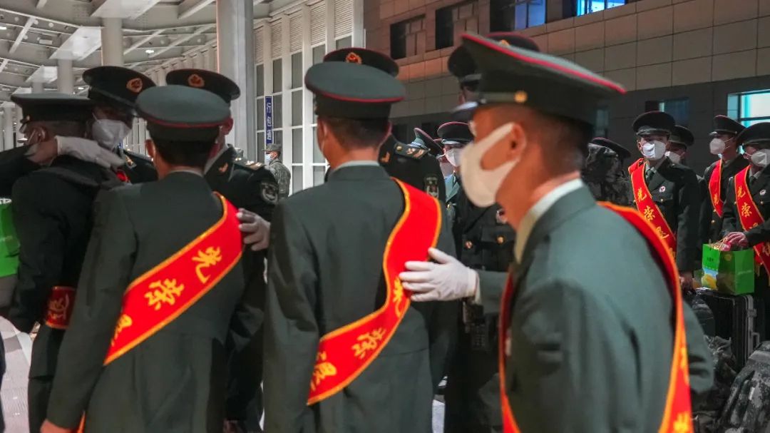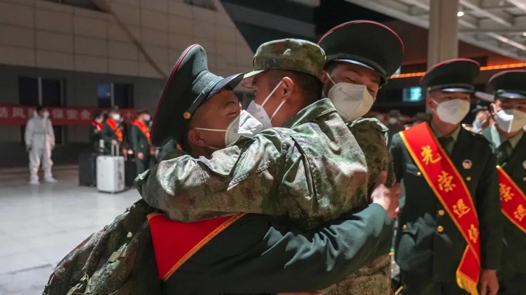 晚会结束后,老兵们乘坐大巴来到火车站,和送站的战友握手、拥抱、轻声叮嘱……千言万语都化作“保重”二字。