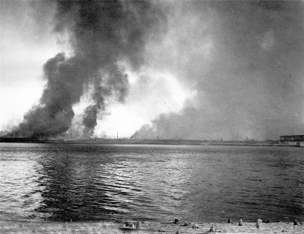 1950年10月初,侵略军悍然越过三八线,并把战火烧到中国边境。图为安东市(今辽宁省丹东市)对岸朝鲜新义州在浓烟烈火中。新华社发(杨振亚 摄)