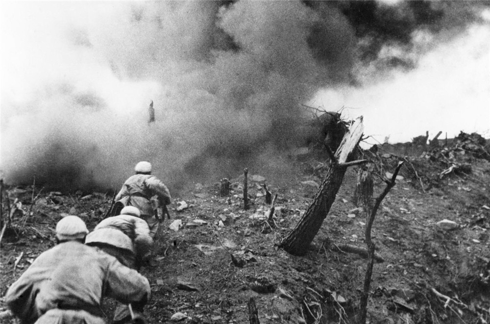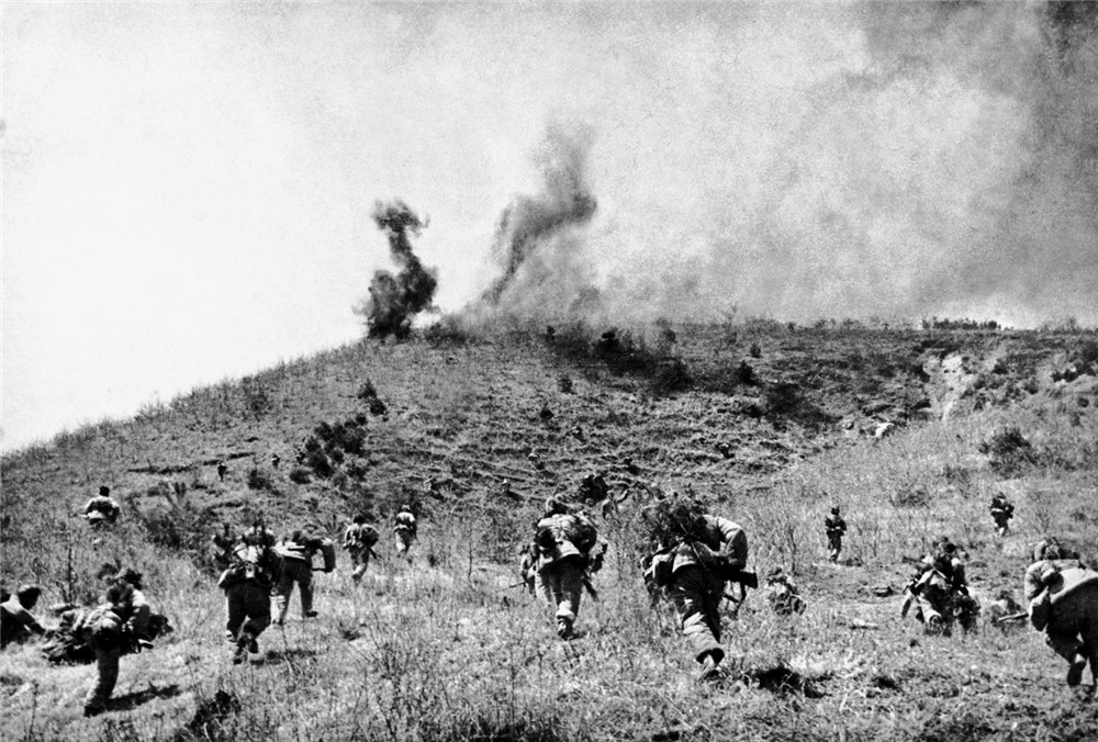 1952年,在上甘岭战役中,中国人民志愿军指战员在炮火支援下,攻上537.7高地北山。新华社发
